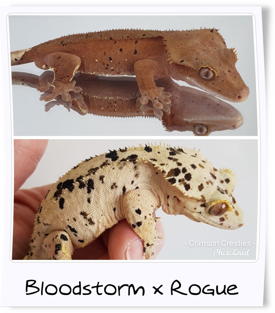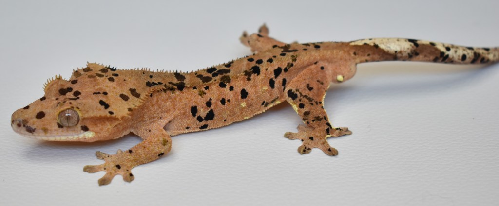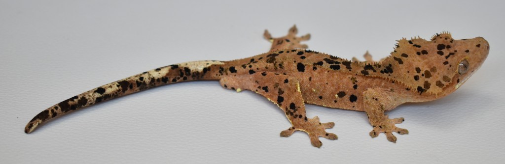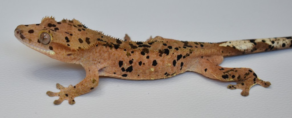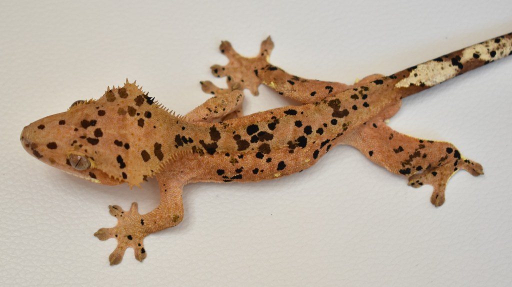 Crumble Morph: superdalmatian inkspot, black and olive spots, portholes, pink base colour, crownedBreeder: Crimson Cresties Parents:Bloodstorm (produced by Lilly Exotics) X Rogue